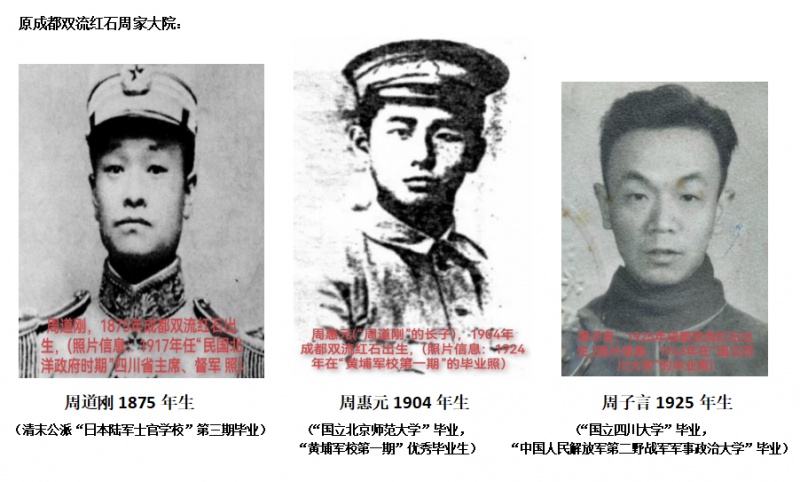 历史是因湖广填四川,祖先周思志从湖广行省迁入成都双流行医,经过几代人的发展,周家逐渐成为当时成都的名门望族,清末民初,红石周家更是涌现出,周道刚、周惠元、周子言、周列三等杰出人物;他们在四川、在全国的历史舞台上扮演了重要角色。